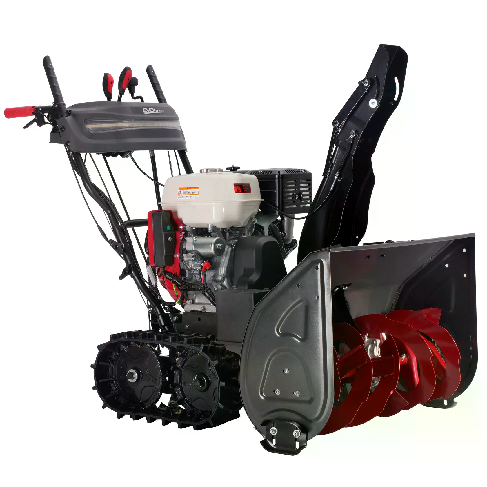 Модель EVOline SBG760THE имеет богатую стандартную комплектацию: LED-фару (светодиодная), подогрев рукояток управления, легкий запуск двигателя от АКБ, а также оснащен такими функциями, как: отключение блокировки дифференциала с помощью курков и управление снегоуборочной машиной одной рукой.