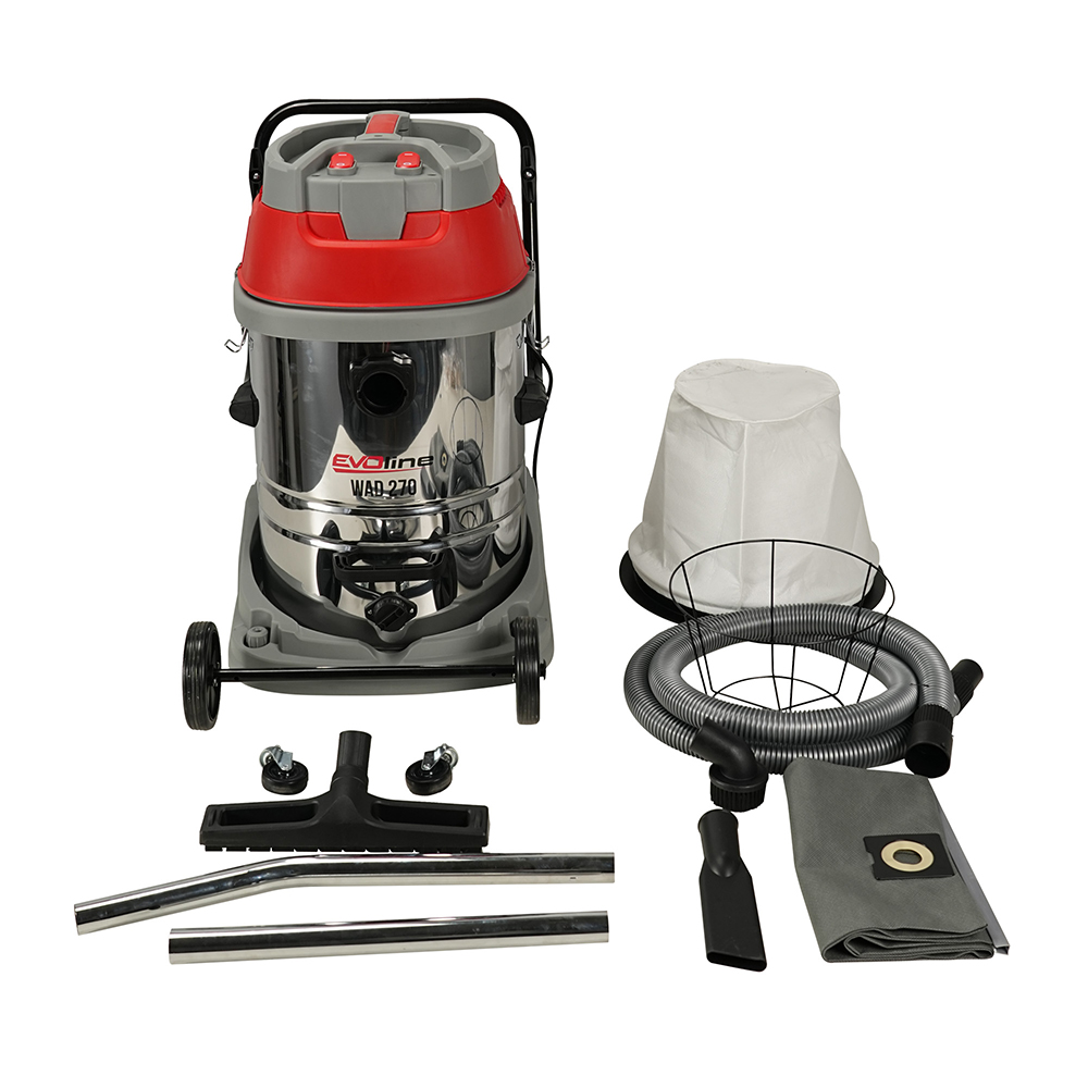Электрический пылеводосос EVOline WAD 270 оборудован двумя мощными турбинами для быстрого сбора больших объемов мусора. Модель предназначен для коммерческого и промышленного использования. Отлично подходит для сухой и влажной уборки. Бак из нержавеющей стали объемом 70 литров позволяет сократить количество технологических перерывов для его опорожнения. Для облегчения очистки бак опрокидывается вместе с ручкой. При необходимости есть возможность снять бак с тележки и установить стационарно в удобном месте. В нижней части бака смонтирована сливная пробка. Турбины могут включаться по отдельности или вместе. К тележке пылесоса может быть смонтирована балка для уборки больших площадей. Прочный шланг длиной 2,5 м. Длина кабеля 5 м.